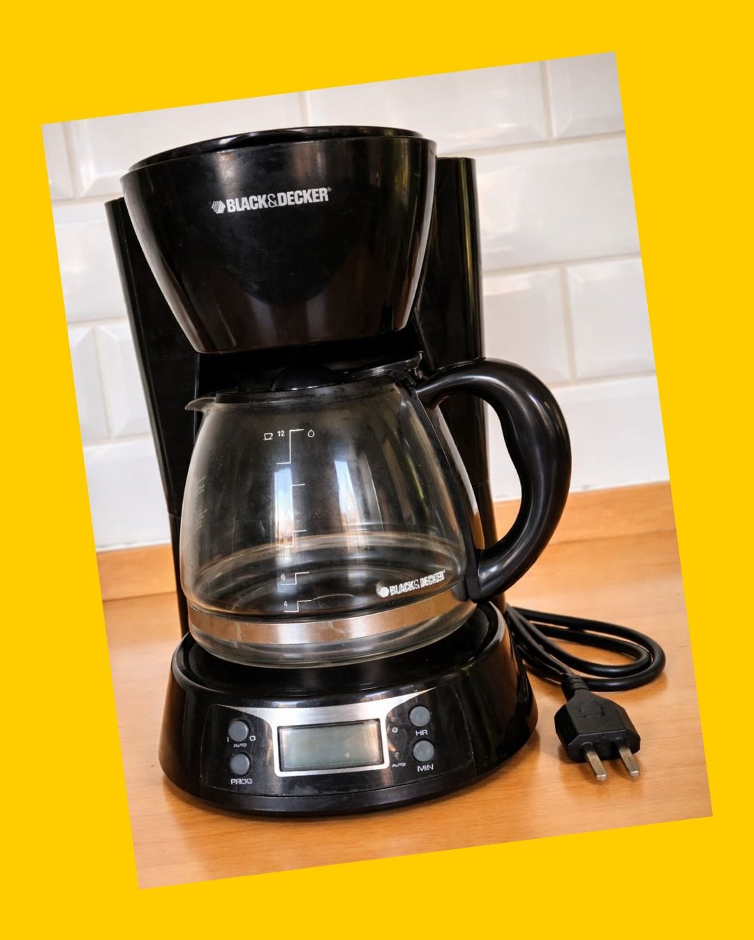 Detalles: Capacidad 10–12 tazas, programable con reloj digital, auto encendido/apagado, potencia aproximada 900–1200 W, jarra de vidrio. Buen estado, funcionando correctamente
