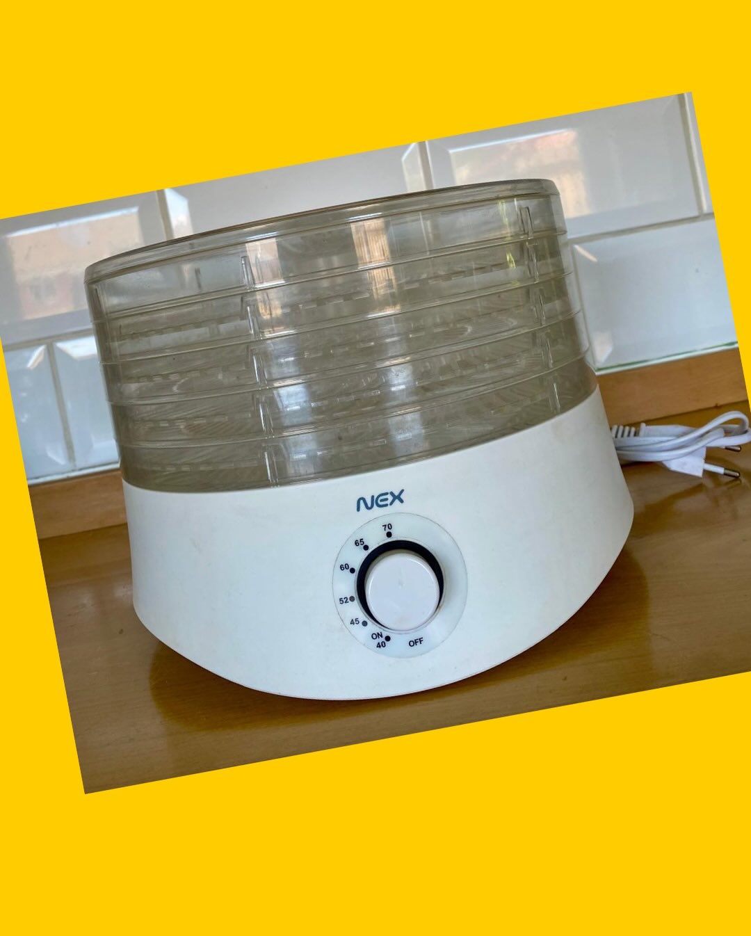Detalles: 5 bandejas desmontables, 6 ajustes de temperatura (40°C – 70°C), potencia aproximada 250–350 W, plástico resistente. Funcionando perfectamente