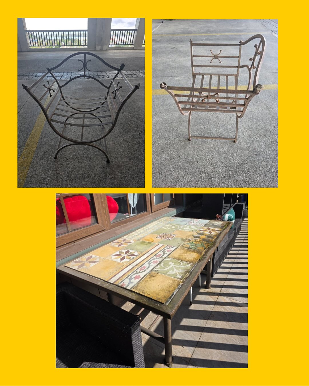 Juego de terraza Fierro con 6 sillas: Mesa de fierro con cubierta de baldosas y 6 sillas de fierro forjado