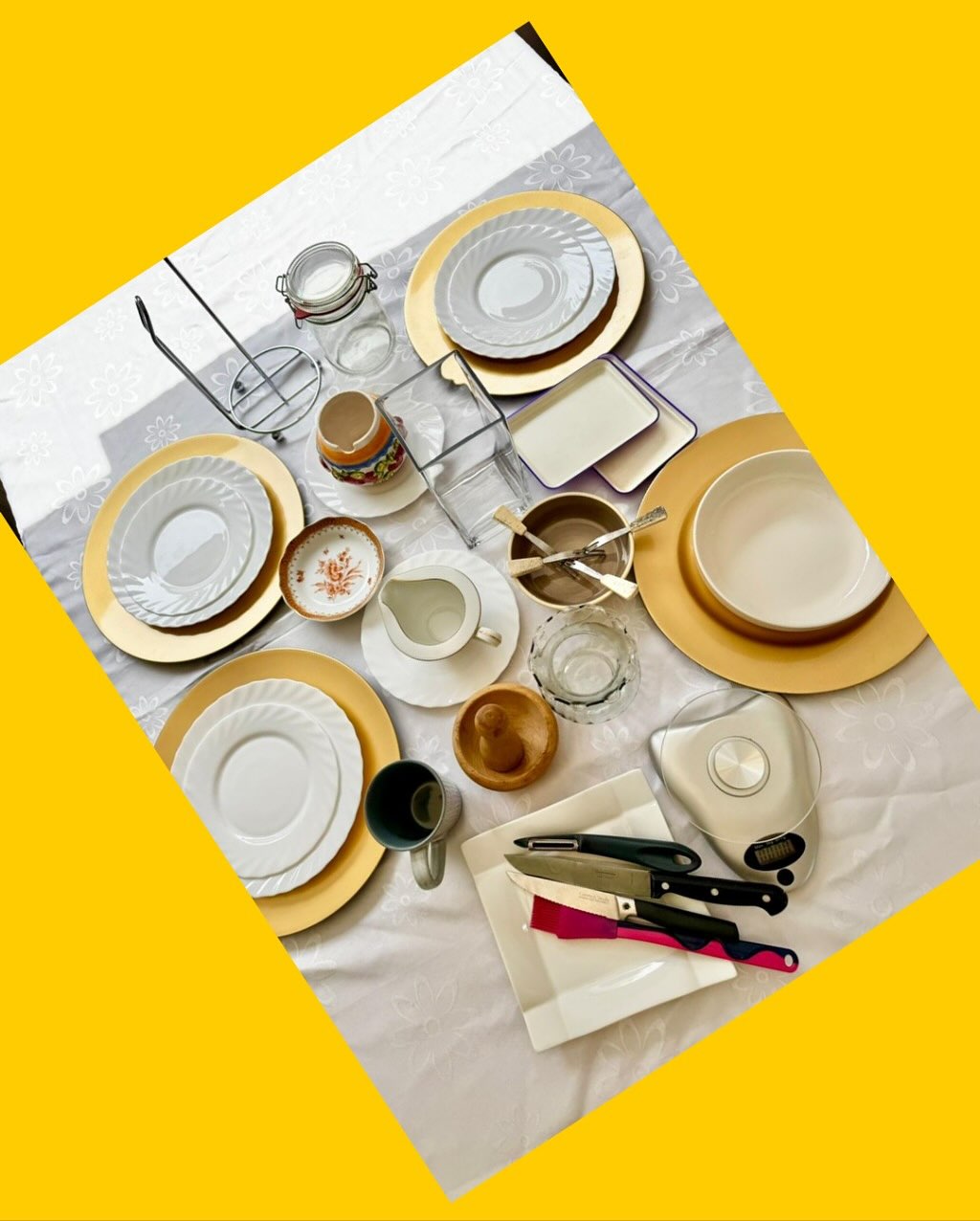 2 jarrones, ensaladera, tres platos de aperitivos, cuenco de azúcar, soporte de toalla de papel, cuchillos, bote de salsa, básculas, tarro de galletas. Taza de 350 ml, mortero de especias.