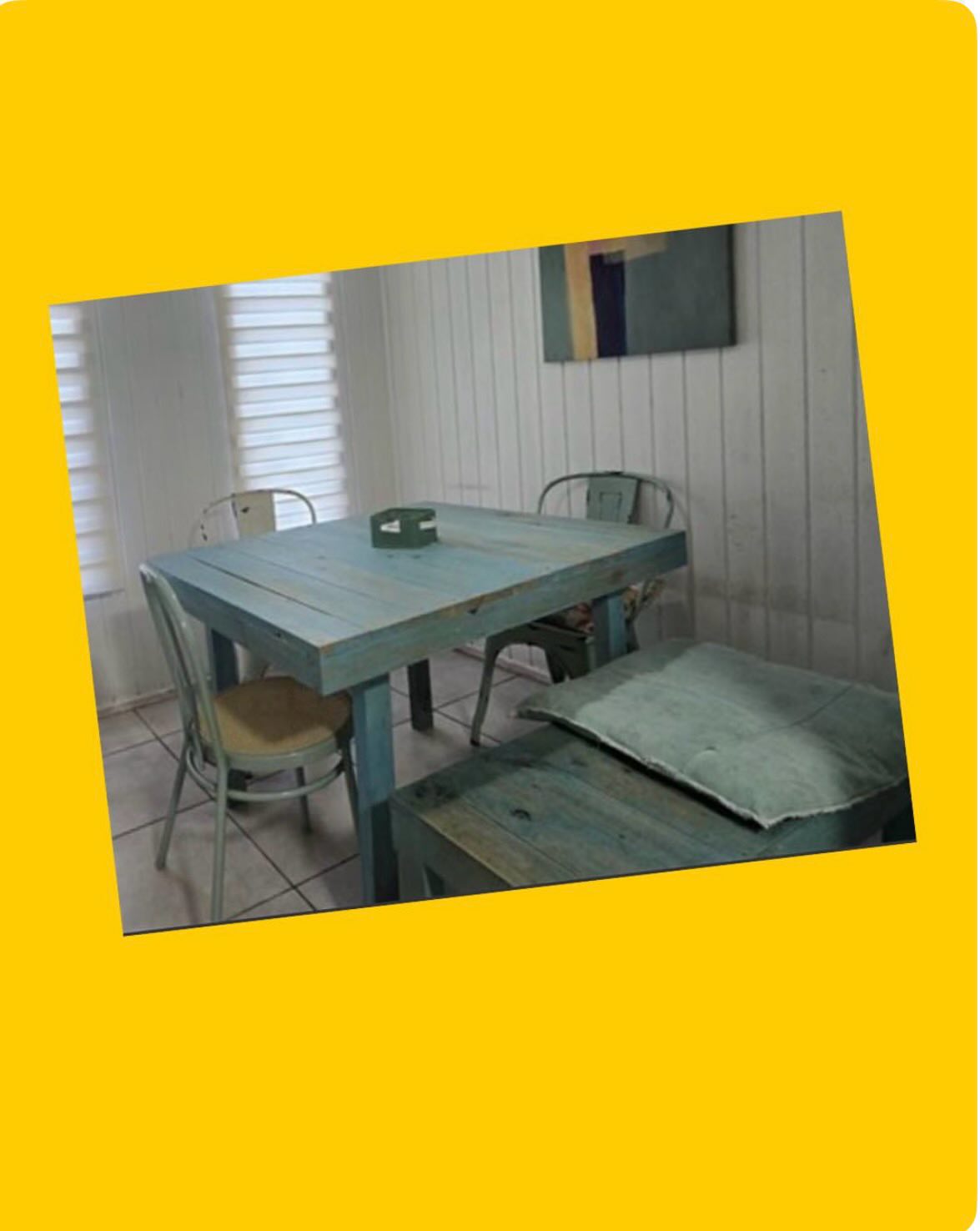 Mesa de madera vintage con banca y 2 sillas