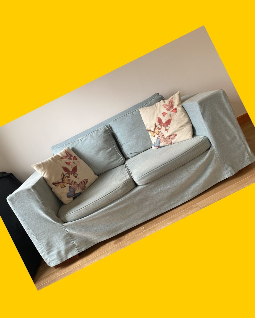 Detalles: Color verde agua grisáceo, incluye funda a medida y cojines decorativos de mariposas, tapiz original manchado, por eso se le hizo funda, medidas 1,6 m ancho × 0,92 m profundidad × 0,75 m alto