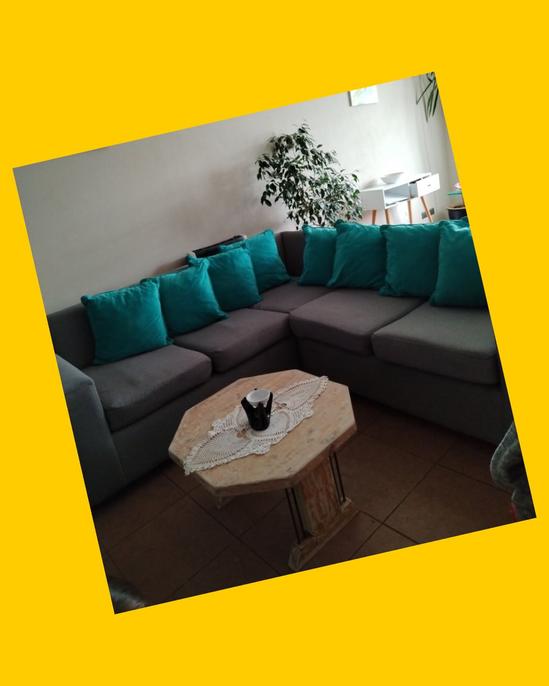 Detalles: Color gris, incluye mesa de centro y 8 cojines decorativos, se entrega lavado, desgaste en tapicería